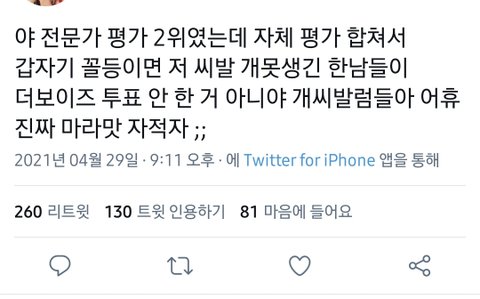 얘넨 밀게 얼굴밖에 없나? 맨날 타돌까는게 외모밖에 없음. 지들도 실력 못믿나보네. 담경연 잘하자 투표하자가 아니라 울오빠안뽑은 니들은 못생기고, 열등감, 견제표야 빼액ㅡ