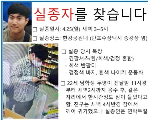 25일 새벽 서울 반포한강공원 인근에서 친구랑 술을 먹은 뒤, 실종되었대