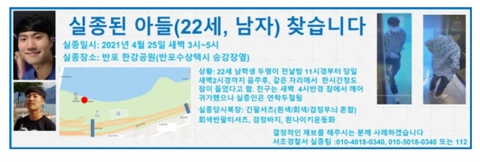 아버지는 한강공원 안을 비추는 CCTV가 없다는 것에 답답함을 호소했다. 실종 사건을 수사중인 서초경찰서에 따르면 반포한강공원 출입구에는 CCTV가 설치돼 있지만, 공원 안을 비추는 CCTV는 없다. 경찰 관계자는 “주차장이 멀긴 하지만 차량 블랙박스 등 확인할 수 있는 모든 수단을 찾고 있다”며 “모든 가능성을 열어놓고 수색을 이어가는 중”이라고 했다.