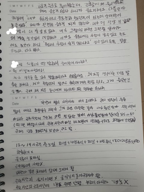 항상 건강을 챙기라면서 사무실 배란다같은곳에서 담배를 너무펴서 목이 너무 아픈데도 그부분을 지적을 하면 저에게 화살이 돌아올까봐 말하지 못하고, 새로오신 여성분이 담배냄새 너무 심하다 말하자 아~그렇냐며 자기가 안한척을 하면서 밑에서 올라오는 냄새라고 합니다. 그전날에 제가 공기너무 안좋다 문좀 열어도 되냐 용기를 내 말을 했을때는 툴툴거리시면서 공기가 뭐가 안좋지 이러시더라고요. 담배를 피지 않는데 오늘 그여성분께 흡연자라고 장난을 치시길래? 네? 저 담배 안피는데요? 라고하면 왜 정색을해~?장난친거잖아. 라고 하시면서 고향어디냐 물어보시는걸 좋아하신다 하셔서 농담으로 사장님 고향만두 좋아하세요? 라고 하니 내가 말했잖아 쓸데없는 얘기하지말라고 생각을 하고 좀 말을 하세요. 어제 말을 해줬는데 또그래 라고 하신다. 내가 예민한걸까 라고 생각을했지만 오늘 새로오신 여성분이 왜이렇게 구박을 하세요~ 라고 하시니 다 나를 위해서 사회초년생이니 가르쳐주는 거라하신다. 성대결절에 걸렸다고 몇번을 말씀드렸다. 담배를 하도 피시길래. 1분도 쉬면 안되는 일이고 담배연기를 들이마시면 목이 정말 안좋다. 그래서 사탕을 입에 물고 있어야 침이나와 목을 낫게 해준다. 사탕을 먹어서 혼이 났다. 난 담배연기 때문에 목도 붓고 하는데요? 저는 사탕을 좋아하지 않아요 사장님. 먹지 않으면 목이 찢어진것같이 아프고 조금이라도 쉬면 뭐라고 하시잖아요... 물뜨러 가는것도 눈치주시는 분께 제가 어떻게 말씀을 드리겠어요. 사장님 하시는 말씀 너무 서러워서 집가면서 운적도 있어요. 스스로를 좋은사람이라고 칭하면서 자랑하고 다니라고 말씀하시는거 저는 거짓말 못해요. 등록금 벌려고 집에서 재택알바 하는거 말씀드렸더니 거기서 에너지쏟고 여기서는 목아프다 하냐 그래서 목이 아픈거 아니냐. 제가 너무 철이 없고 꼬인걸까요...?가슴이 너무 답답하고 스트레스때문에 한숨이 너무 많이 나와요...하루에 하셨던 얘기만 적기 시작하면 노트에 5장은 적을 수 있어요. 책상에는 펜과 종이와 노트 그리고 전화기만 있으며 핸드폰 사용은 금지입니다. 살기가 너무 싫어요. 저 사진은 제가 너무 스트레스가 받아서 일하면서 혼자 끄적여 봤네요... 긴글 읽어주셔서 감사합니다. 너무 많아서 여기까지만 적으려 합니다. 적으면 한없이 길어질 것 같아서요...등록금 벌기 너무 힘드네요 정말. 조언좀 부탁드릴게요...----------------------------------------------------------------------------------------교육 받으시다가 여성분이 뛰쳐나가셨어요. 너무 슬퍼요... 겨우 새로운 분이 저와같이 일하게 되서 정신적으로 그분은 모르시겠지만 사실 너무 좋았어요. 담배냄새 난다. 라는 말을 오자마자 해주셔서 공기도 좋아지고사장님과 논쟁후에 갑자기 안하시겠다고 말씀하시고 나가시더라고요. 저 같아도 나갈 것 같아요. 사장님은 항상 자신의 말이 다 맞거든요. ex) 나 BTS봤다? "BTS가 아니라 방탕소년단 이겠지" 모든 화법이 이렇습니다. 모든지 시험하려들고 자신을 굉장히 똑똑하다 생각하고 남을 깎아 내리려 하거든요.