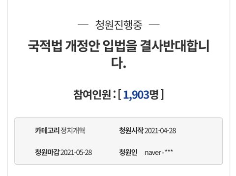 국적법 개정 막아야 합니다. 이제 영주권자 자녀들 신고만으로도 국적 얻을 수 있대요. 문제는 이중국적 인정해서 군대 가기전까지 꿀 빨다가 나중에 국적 버리면 그만입니다 ㅜㅜ 또 투표권이랑 시장, 국회의원, 대통령까지 출마할 수 있고요.. 매년 약 700명이 한국인 된다는데 대부분이 중국인임ㅜ 이러다가 먹힐 것 같습니다.