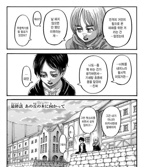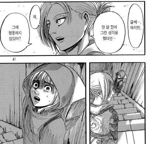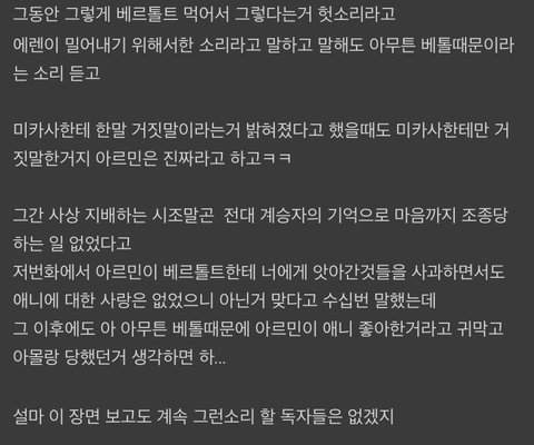 이 외에도 더 많은 떡밥 있는데 __메가 음흉하게 아르민>애니 감정선을 대놓고 안보여줌.. 1부때부터 서사 쌓아온거 보면 만들기 전부터 계획한거같은데 정확한 장면을 안보여줘서 조카 답답함ㅅㅂ 근데 그렇다고 베뇌점은 진짜 아님