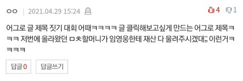오늘 주제는 주제 추천해준 댓쓰니가 말한것처럼 '할머니가 임영웅한테 재산 다 물려주시겠대;;' 이런류의 어그로 글 제목 짓는거야 ㅋㅋㅋㅋㅋㅋ 재밌는 댓글 많이 달아줘ㅎㅎ⭐