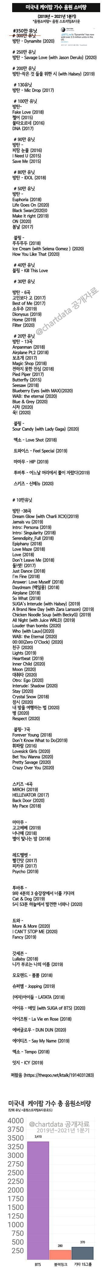 미국내 케이팝가수 음원 소비량(2019~2021 1분기)