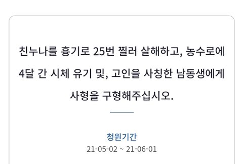 이건 그 살인자 처벌하라는 청원인데 시간 나시는 분들 한 번씩 청원 부탁드립니다.