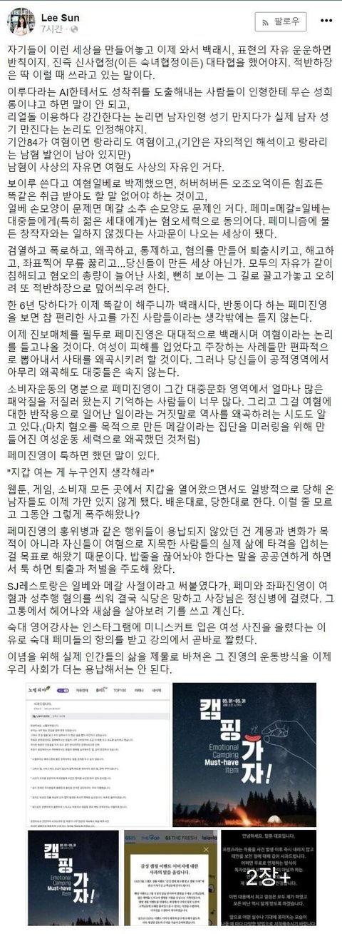 페미니즘 자체가 정당성을 잃어버림 메갈하고 융화되면서부터 여성인권을 올리자는게 아니라 남성인권을 깍아먹자, 남자들은 적이다 이런식으로 타겟팅을 바꿈 그리고 소름돋는건 페미가 활개친 이후 실제로 여성인권이 딱히 향상되지도 않았다는거 진짜 중증 페미들은 여자가 남돌 빠는것도 못하게함 거의 정신병 수준으로.. 이러니 남초/여초 괴리감만 더 심해지고 높으신자리에 있는 분들은 정작 여성인권 자체에 관심이 없음 부수적인 표 를 얻으려고 애쓸 뿐이지 근데 엎친데 덮친격으로 일베같은 여혐 남초뿐만 아니라 그냥 거의 모든 남초들이 예전 페미, 메갈들이랑 똑같이 테러하기 시작했음 아무 논리 없이 태클걸고 불편해지는거지