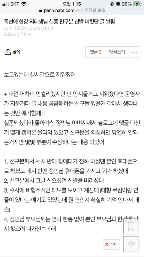 베플쓴사람인데 한강실종이라고치고 글 쭉보고 있었는데 친구 의심글 2개 새벽 1시에지워졌었음 혹시몰라 캡쳐해둠