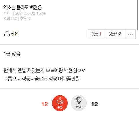 일부러 한쳐먹어서 팬덤 다지기 하려고 작당하고 쇼 하는 건지 가끔 궁금함 전원 다 까였는데 맨날 “백현만 이래 백현만! 열폭이야!” 이러는 것부터 시작해서 엑소는 모르는데 백현은 1군이라는 것도 웃김ㅋㅋ 그렇게 치면 음원 더 잘나온 종대디는 0군이여 뭐여 종대디 극혐이라 올려치기 싫은데 엑소 후려쳐서 꼭 언급을 하게 만들어 그리고 방탄이랑 백현만 까였다는 건 시즈니 더비 캐럿 여돌들 심지어 아미녀들이 봐도 웃길 거 같음 까인 돌이 몇이고 엑소멤이 몇인데 특히 요즘 타돌들이랑 비교하면 백현인 덜 까인 편인데 지들 눈에 방탄 백현만 보이는 거 인증하는 거 같고 조카 웃김