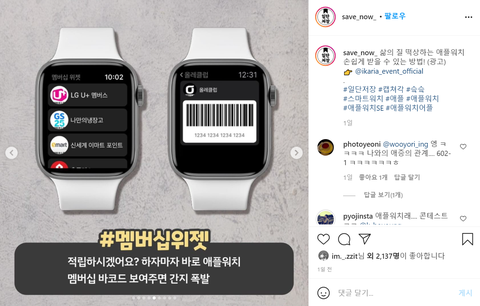 글고 단순 디자인을 뛰어넘는 킬포 간지 ㅇㅇ 멤버쉽 적립할때 그냥 애플워치 화면에서 띄어서 보여줄 수 있음 ㅋㅋㅋㅋㅋㅋㅋㅋ