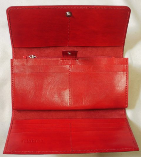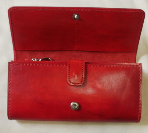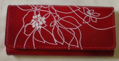 가죽에 레드 컬러로 천연염색하고 판화기법 디자인 및 카빙하여 제작한 핸드메이드 3단 장지갑입니다.(마디샤가죽공예