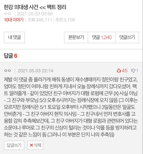 오늘 (5월 3일) 우리 엄마가 장례식장에 직접 다녀오셨고, 정민이 어머니와 이야기한 팩트를 알려주려고해. 아까 '한강 의대생 사건<<팩트정리' 라는 글에 댓글을 남겼고 몇몇 댓쓰니들이 직접 글을 올렸으면해줘서 올려.