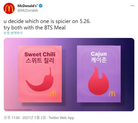 전세계 맥날에서 방탄 노래와 한국어가 적힌이 크ㅡ