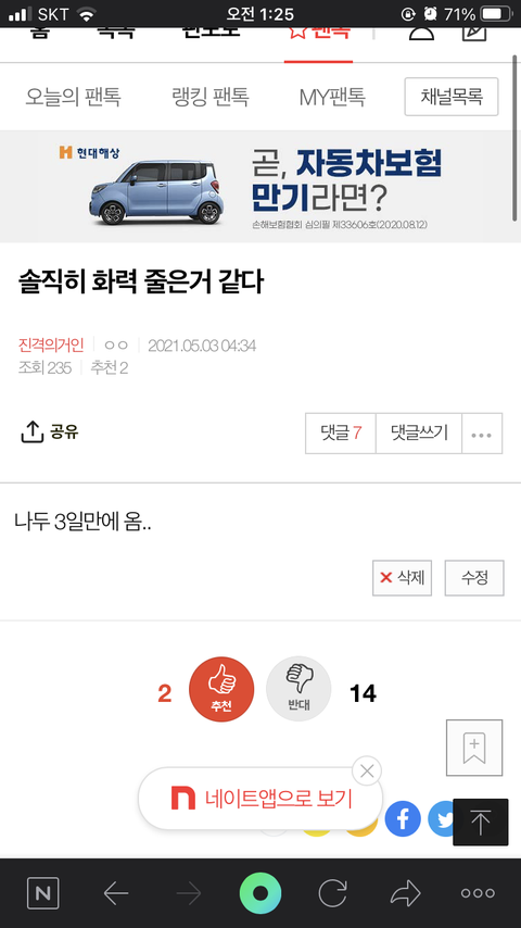 솔직히 삼일은 아니고 내가 몇시간 전에 쓴글 바로 밑에 있길래 심하게 과장 한거긴 한데 응..미안 이제봄 글 지욹겡