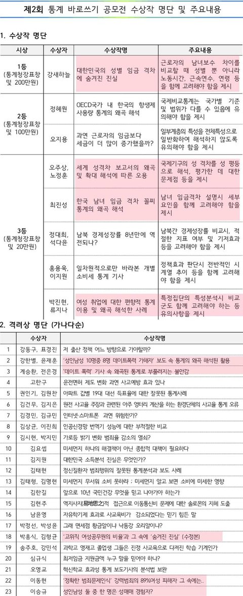 통계청에서 통계의 해석오류와 왜곡을 바로잡기 위해 공모전을 열었는데 수상작 대부분이 페미나 여성단체들이 '우리들이 이만큼이나 불리하다!'라며 신나서 결과를 인용하는 통계들이었음. 감정적인 여성들의 피해의식을 조장하고 근거가 있든 없든 분노를 불러일으키는 건 돈이 되거든