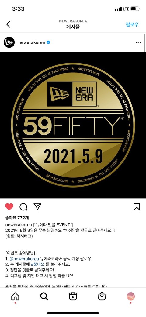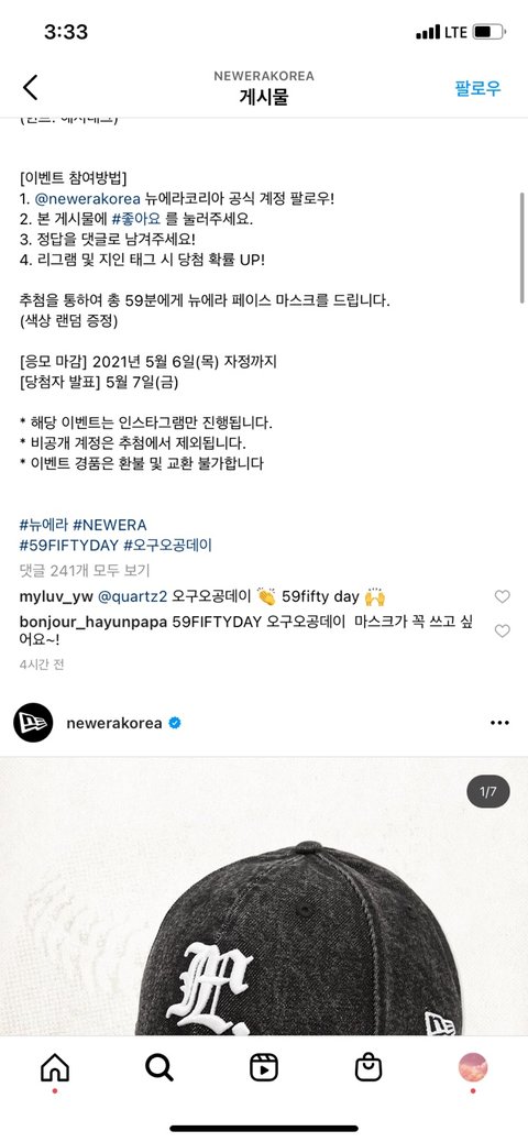 뉴에라 인스타 댓글이벤트 한당 ㄱㄱ