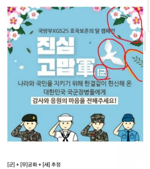 저 포스터에 여러그림과 글자들이 있는데 그건 다 재껴놓고 '군'이라는 글자, 새, 무궁화의 첫글자만 골라 읽음