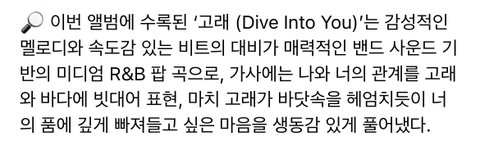 제목부터 알앤비인 것까지 조카 좋음 이게 내 최애곡 될듯ㅠㅠㅠㅠㅠㅠㅠ 가사도 너와 나의 관계를 고래랑 바다에 빗대서 표현했대ㅠㅠㅠㅠㅠㅠㅠ ㅅㅂ 개좋다