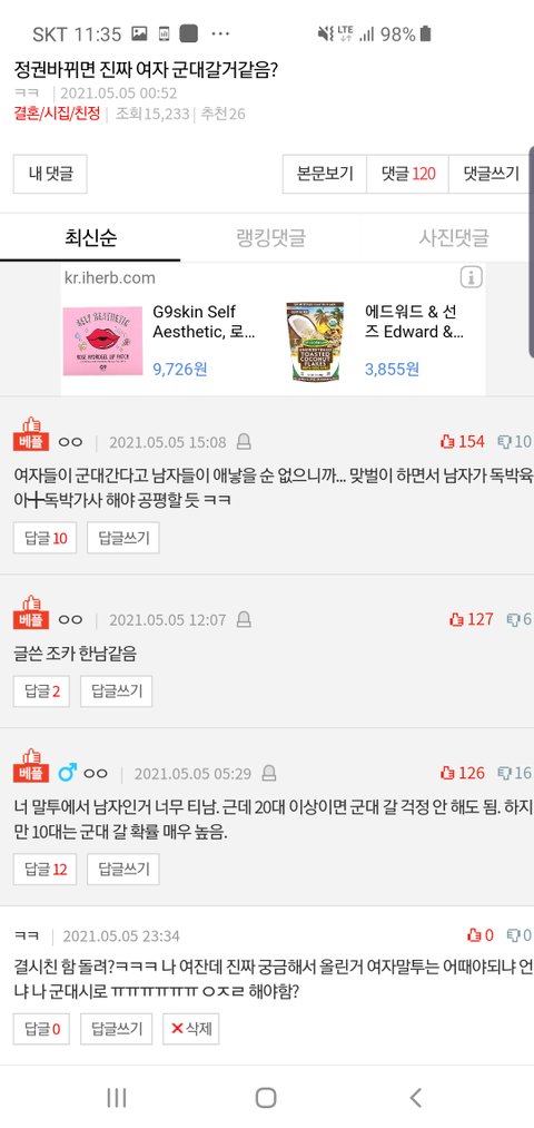 근데 나진짜 여잔데 솔직히 군가산점 인정해주는거보다군대가는게 낫다