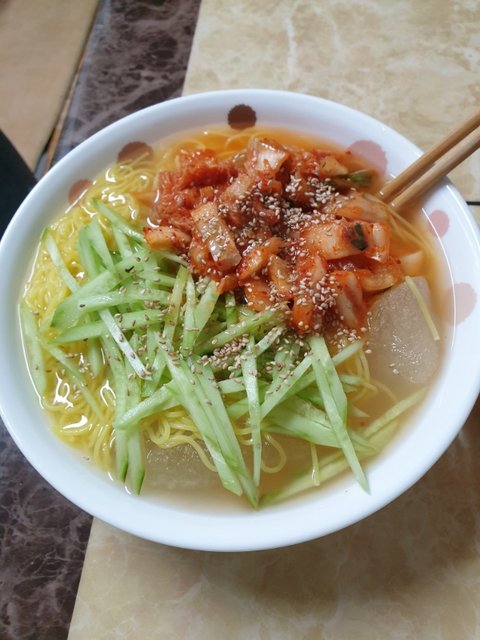 국수에 냉면 육수 넣고 오이 채쳐 놓은거랑 김치 얹고 참기름 들기름 둘다 넣어야 맛있어요.