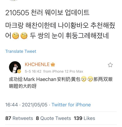 천러 웨이보 업뎃했네 천러가 마크랑 해찬이한테