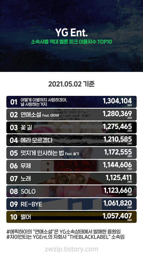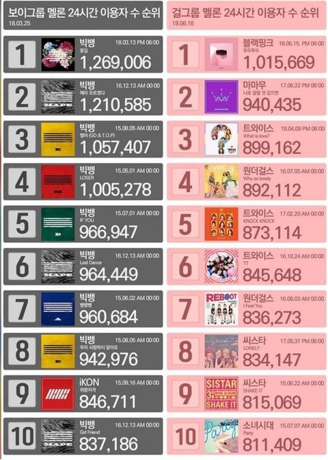 예전에 짤로봤을때 남돌피크(?) 그거에 싹다 빅뱅곡 메이드 들어갓엇던거 ㅋㅋㅋㅋ개소름이었는데... 음깡 와쥐.. 대히트곡 연간 1위곡인 아이콘이 없다는게 ... 그리고 블핑도ㅋㅋㅋ 생각보다 쟁쟁하누! 제니 이용자수 무엇..? 악뮤는 아직도 차트인임ㅋ 지디는 워낙 아직도 건세한듯