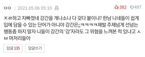 ㅋㅋㅋㅋ급발진하는거 보니 워딩 씨게 먹혔나보네. 일반 남성들은 입에 함부로 담지도 못할 '강간'이라는 단어를 시선강간, 인형강간, AI강간 아무때나 남발해서 쉽게 입에 담을 수 있도록 친히 배려해준게 누구일까?
