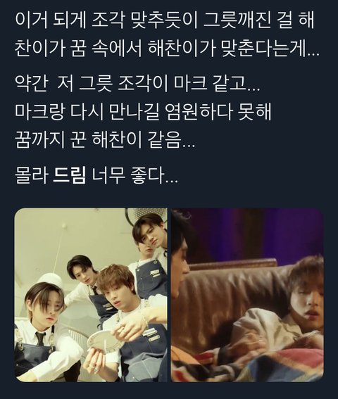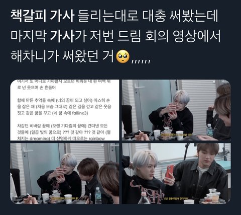가사 해찬이가 써온 거임 (함께 꿔온 꿈들은 또 누군가의 꿈이 되가고 우린 같은 꿈 속으로 더 선명하게 떠오르는 rainbow)
