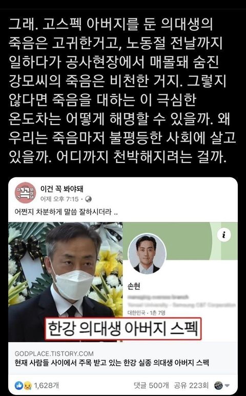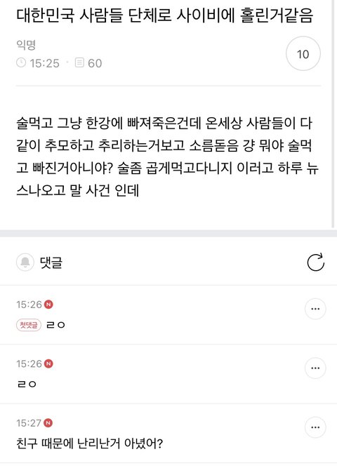 저기 어디에 남자라서 심한 말이 있음?ㅋㅋㅋㅋ 글고 틀린 말도 아니지 솔직히 한강에서 술마시고 돌아가신 사람들이야 지금까지 계속 있었는데 이번 사건이 유독 뇌절하는게 심한거야 걍 처음 실종 보도되었을 때 안타깝고 끝났어도 충분했음 본인 과실로 인한 죽음인지, 타인에 의한 죽음인지는 수사기관이 밝혀야하는거고 온 국민이 누가 범인이 확실하네 누구 잘못이네 이러면서 숟가락 얹을 일이냐? 난 이 짤 공감함