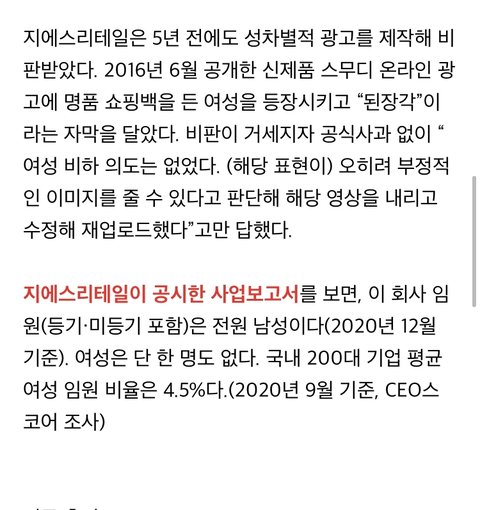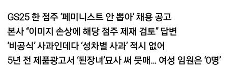 여기서 중요한 건 GS25가 사과를 했다는 점임 GS25 상계제일점의 여성차별채용 공고문에 대해서는 아직도 공식적인 사과 한마디 안 했어. 남초 커뮤의 억지스러운 주장에는 바로 사과+수정하고 여성 차별에는 눈감겠다는 것 그도 그럴 것이 GS리테일의 여성임원은 0명