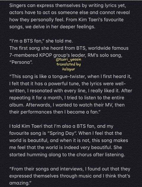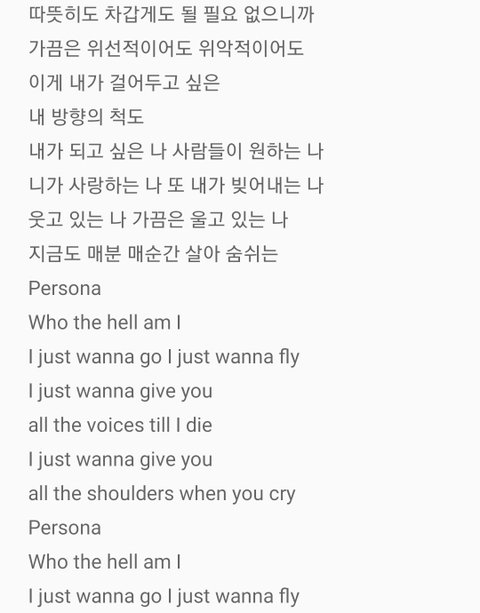 "이 곡은 tongue twister 같아요. 처음 들었을 때 이 곡이 파워풀한 곡조를 가졌고, 매우 잘 써진 가사라고 느꼈어요. 모든 가사에 공감했고, 정말 좋았어요. Persona를 약 한달 정도 반복해서 들은 후에, 전체 앨범을 들었어요. 그리고 후엔, 그들의 뮤비, 또 후엔 공연이 보고 싶어졌고, 그들의 팬이 되었어요."