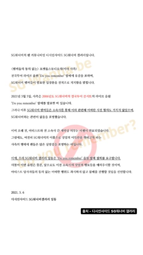 상업적 목적의 수단으로 SG워너비를 이용하는 비도덕적인 행위에 강한 유감을 표명하는 바이며, 관련 음원 발매는 SG워너비와는 전혀 관련이 없습니다