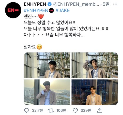 엔하이픈 트위터 구경하다가 깜짝 놀람 ㅋㅋㅋ 신인인데 그냥 일상 사진 올렸는데 리트윗 십만에 하트가 삼십만이 넘네