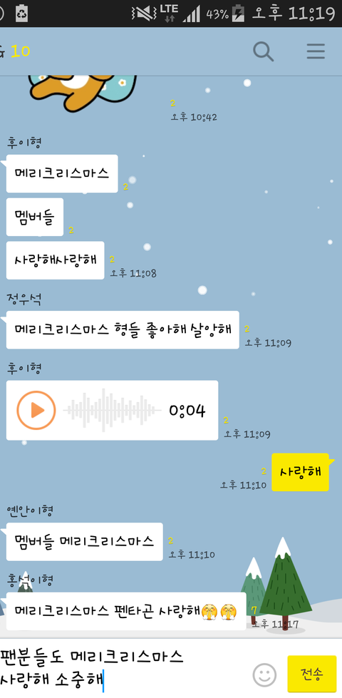 2016년도 크리스마스인데 크리스마스라고 단톡에 멤버들 사랑해 펜타곤 사랑해가 나온다는게 너무 몽글몽글 ㅎㅁㅜ