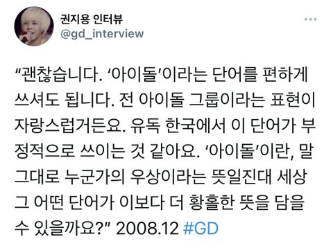 진짜 말 너무 이쁘게하지않아?? 솔직히 이당시에 아이돌에대한 인식이 좋은편은 아니었고 지디는 탈아이돌이라는 소리를 듣는 입장이었음에도 불구하고 아이돌의 위상을 높여주면서 주변아이돌들에대한 존중까지 느껴지는 답변이어서 너무 멋있다...