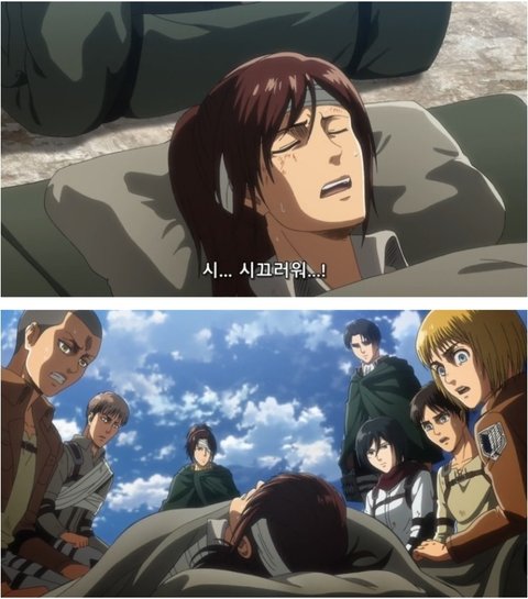 사샤 리바이한테 "시끄러워" 한 거 웃으면서 보고 있었는데 생각해 보니까 사샤 죽기 전에 한 말이 시끄러워임.. 미쳤어 진짜.. 특히 죽기 전 시끄러워는 정말 모든 걸 포기한 느낌이라 주위에서 들리는 소리까지 고통스럽고 그냥 쉬고 싶어서 한 말 같아서 더 찌통임.. 울 딸랑구 다시 살아오라는 말은 못 하겠다.. 그냥 편히 쉬고 담생엔 맛난 거 많이 먹자ㅠㅠ