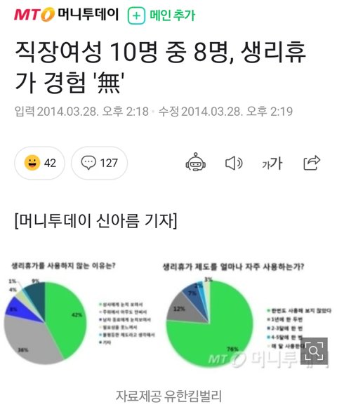 생리휴가 써본적 한번도없다 진심ㅋㅋㅋ나말고도 회사내 모든 여직원 다 쓴사림 없었음(본인 인사팀) 그리고 그런거쓰면 회사에서 얼마나 눈치주는지아니?