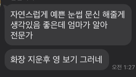 생리때문에 빡쳐서 눈썹 다밀고 속상한일 있어서 개쳐울었더니 쌍커풀 소멸+피부뒤집어젬 상태인데 엄마랑 안친해서 얼굴 안보고 사는데 어제 좀 대화했거든? 근데 저렇게 톡와있음ㅅㅂㅋㅋㅋㅋㅋㅋ큐ㅠ