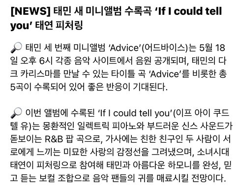 5월 18일 태민 advice 군입대전 마지막 앨범 많은 관심부탁해ㅠㅠ태연이 피쳐링하는 If i could tell you 수록곡도 많이 들어줘~^^