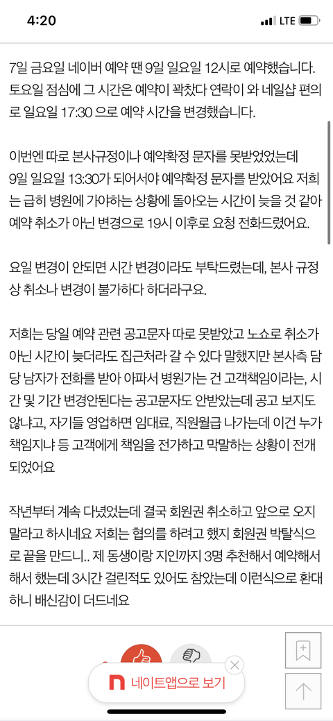 당일 예약 변경 안 해 줬다고 남자친구분께서 직접 전화 하셔서 뭐라하시고 회원권 환불까지 해 드렸는데 이렇게 뒤에서 본인 유리한쪽으로 글을 작성해서 올렸네요 ;