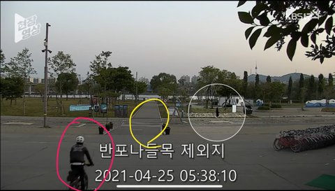 - 자전거를 탄 사람이 자전거 도로가 아닌 인도쪽 (물가근처)으로 이동하여 자전거를 주차하고 왔다갔다를 반복.
