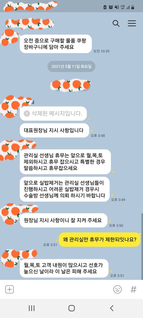 근무 한지 9개월이됐는데 갑자기 카톡으로 저렇게 휴무일을 지정해서쉬라하고