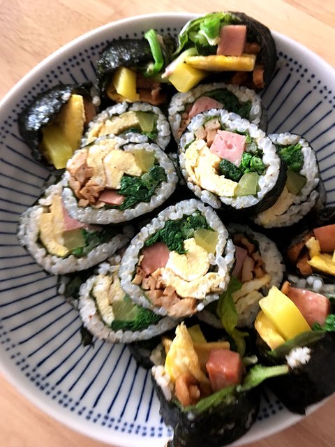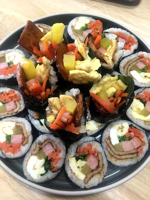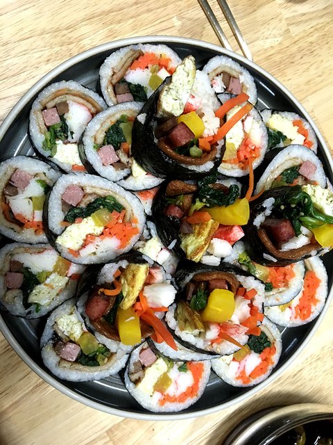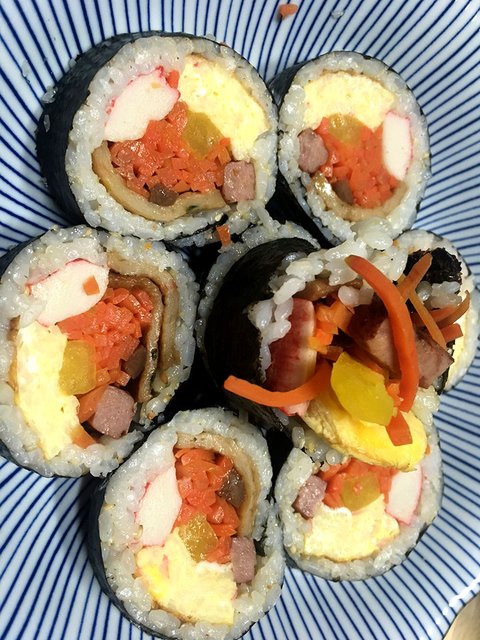 김먹고 밥먹고 반찬먹는거나 별 차이 없을지는 몰라도저는 아직은 김밥이 너무너무 좋습니다.집에서 있는재료 최대한 다 꺼내서 둘둘 말아썰어놓고 하나씩 집어먹으면 치킨이나 족발도 생각나지 않는 맛입니다.