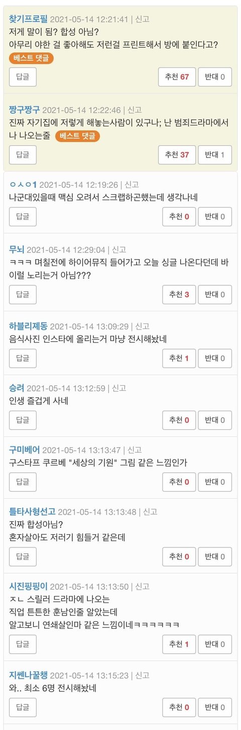 저런 반응 나올만 하지 ㅋㅋㅋㅋ 아니 상식적으로 누가 여자 나.체 사진을 방 벽에다 붙여놓고 사냐