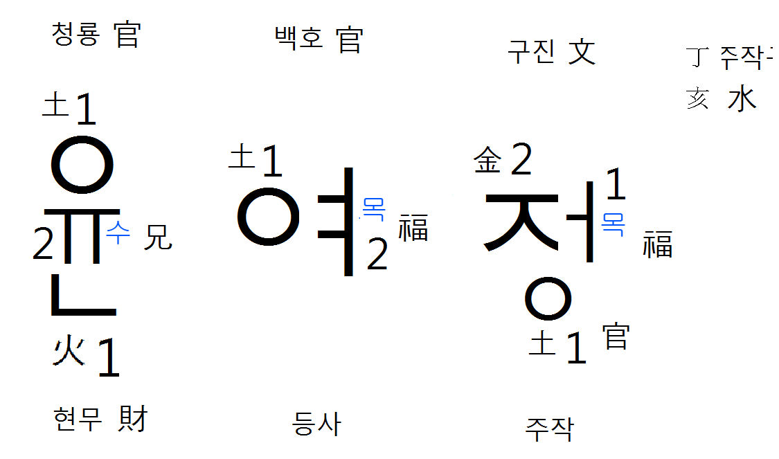 음력 을묘(乙卯)대운으로 본다면 활약상 말자(末字)대외궁(對外宮)이 매우 좋다하는 청룡 주작이니 퇴각했든 청룡이 돌아온 모습이다 묘(卯)는 목성(木性)이 종성(縱聲) 직장(職場)터전 청룡이라 매우 길하다 주성(主聲)주작(朱雀)관(官) 매우 화려하고나 재능(才能)모음(母音) 모태(母胎)상징 집단이 청룡 주작 상관(傷官)에 들엇으니 그야말로 좋은 방향 명진사해(名振四海)하는고나 자신을 상징하는 중간(中間)자(字)에 호응하여 주는 등사(騰蛇)길신(吉神)이 낙점되니 그야말로 일신이 화려하고 반듯하게만 보인다 낚시 바늘이 되선 큰 대어(大魚)를 낚은 형국이다 재능과 관록궁이 다 화려하다는 거다