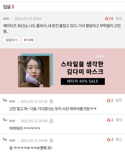 이건 저번에 데이신 거 봐서..댓글인증입니닷..그러고 보니까 그 때도 욕하러 들어가서 사진 얻고 나왔는데...
