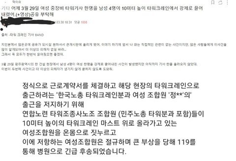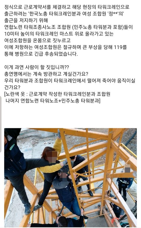 3월 29일에 10미터 높이에서 일하고 계시는 여성 중장비 타워 기사 한 분을 남성 4명이 강제로 끌어내리려 한 사건이야 사진에도 나와있지만 이 여성분 괴롭혀가지고 출근 제지해서 퇴사시키고 그 빈자리를 본인들이 차지하기 위해서래... (복사함)