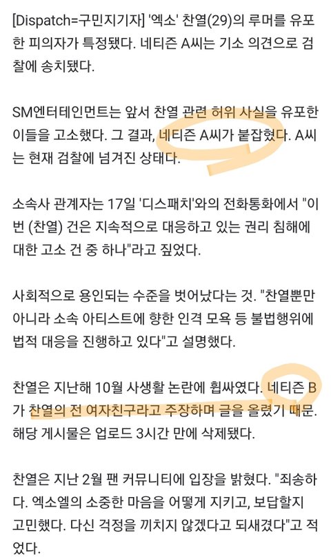 아니 왜 이해를 못해 붙잡힌 사람 A 전여친은 B 그러니까 걍 박찬열 악플러가 잡힌거고 전여친이 잡힌게 아니니까 박찬열일이 루머가 아니라고