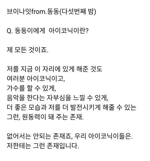 전에 누가 아이콘한테 아이코닉은 어떤 존재냐고 물어본적이 있었는데.....나 왜 이 영상을 잊고 있었지? https://youtu.be/-DvwHXYXtTo 애들 눈물고이는것처럼 보여서 같이 울면서 글쓰고 있어ㅠㅠㅠ