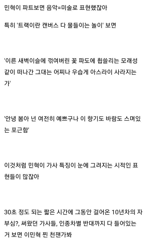 눈에 그려지는 듯한 시적인 표현을 많이 쓰는게 민혁이 가사 특징이잖아