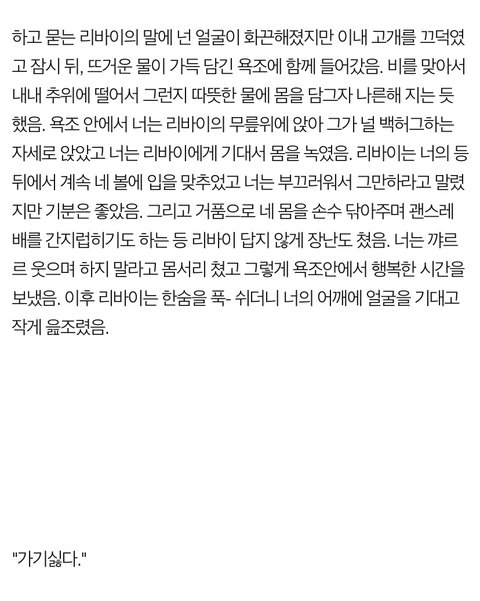 일단 오늘 올라온 꾸금 잘봤어 진짜 내 jam zㅣ가 요동 치더라ㅠ 근데 49편 읽다가 궁금한거 생겼는데 드림주랑 리바이랑 같이 욕조에서 씻었을때 리바이 그1곳 서1있1었어? 너무 궁금해 만약 서1있1었다면 드림주가 리바이 위에 앉아있을때 느껴졌을거아냐 머쓱타드일듯 근데 너무 좋다 역시 우리 리바이님 마초야 마초 사랑해